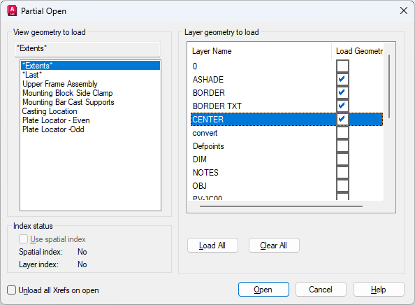 When working with large drawing files, you can select the minimal amount of geometry you need to load when opening a drawing.