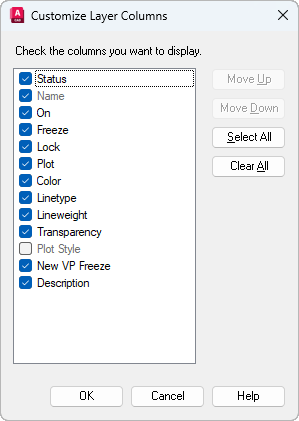 Sets which columns are displayed in the Layer Properties Manager for the current Model tab or layout tab.