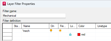Displays the properties of layers that determine which layers are listed. You can click to specify one or more properties to define the filter. All the properties specified on a single line in the filter definition must be true to display a layer name (a logical AND). Subsequent lines in the filter definition each specify alternative criteria (a logical OR).