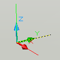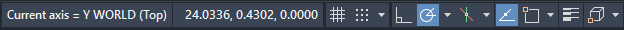 The default active axis is the X axis. The active axis is shown by a broken line extending from the UCS icon origin. To rotate the UCS about the active axis, click and drag the screen pointer perpendicular to the axis. The first pane of the mode status line reports both the active axis and the current rotation, relative to the current orientation.
