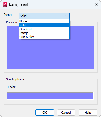 Lists background overrides (None, Solid, Gradient, Image, or Sun & Sky) that you can apply to a named view.
