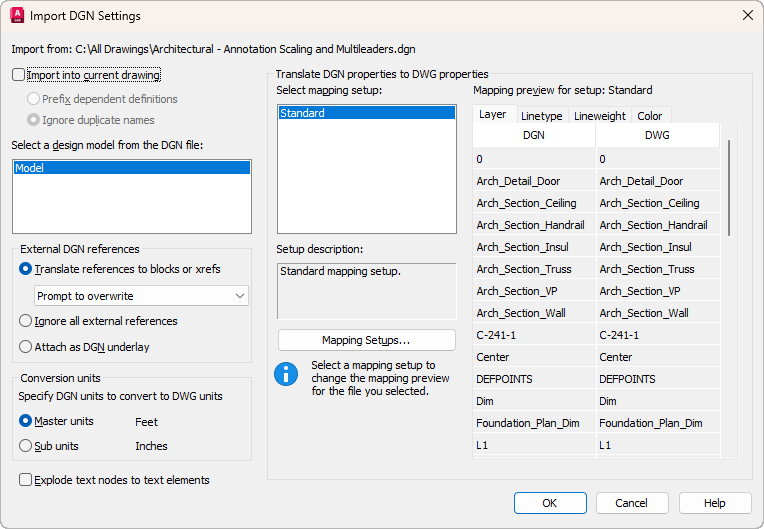 Converts DGN references to blocks when importing into a current drawing and to xrefs when importing into a new drawing.
