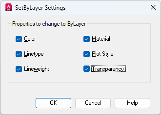 Changes the transparency value of selected objects to ByLayer. (SETBYLAYERMODE=128)