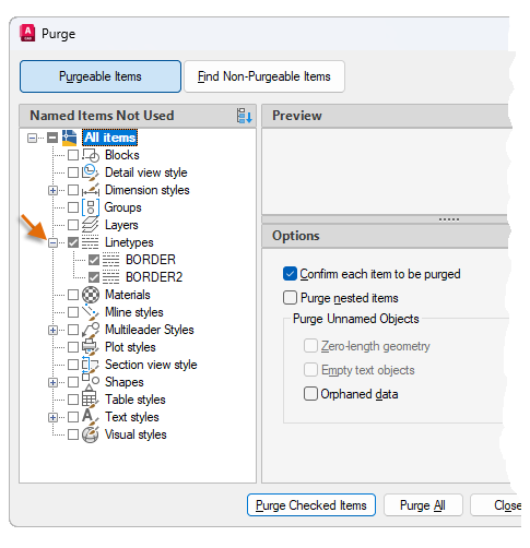 To purge specific linetypes, expand the Linetyles tree view. Then select the linetype definitions to be purged.