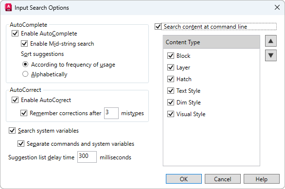 The command line suggestion list provides a quick way to access commands, system variables, and named objects (content) such as blocks by typing part of the name on the command line. Settings specify which items are displayed, their order, the delay before the list expands, and how much help the program provides as you type. You can also set whether the list displays suggestions only for commands and content that start with the letters you type, or also for commands and content that contain those letters (mid-string search.)