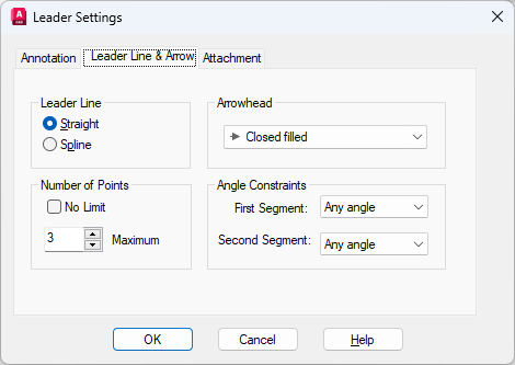 Sets the number of leader points that QLEADER prompts you to specify before prompting for the leader annotation. For example, if you set the points to 3, QLEADER automatically prompts you to specify the annotation after you specify two leader points. Set the number to one more than the number of leader segments you want to create.