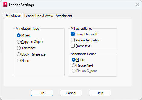 Sets the leader annotation type. The type you select changes the QLEADER leader annotation prompt.