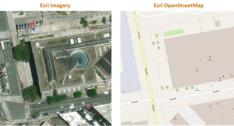 You can display the map as a satellite image (Esri Imagery) or as a vector image (Esri OpenStreetMap). If the drawing area is divided into multiple viewports, each viewport can have a different style of map.