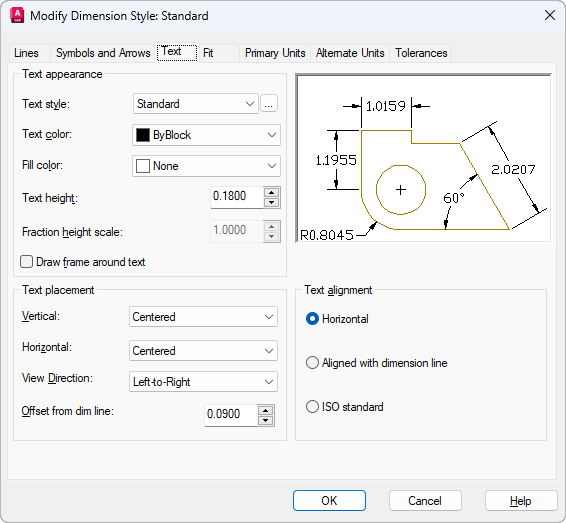 If the text style specified on this tab has a fixed text height, that height overrides the text height set here. If you want to set the height for dimension text here, make sure the height of the text style is set to 0. See the STYLE command for information about setting text height for text styles.