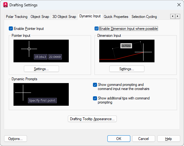 Controls pointer input, dimension input, dynamic prompting, and the appearance of drafting tooltips.