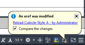 By default, if a referenced file has changed, a balloon message is displayed near the Xref icon in the lower-right corner of the application window (the status bar tray). Click the link in the balloon to reload all changed xrefs.