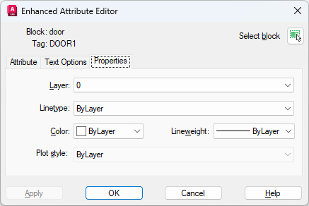 Defines the layer that the attribute is on and the lineweight, linetype, and color for the attribute text. If the drawing uses plot styles, you can assign a plot style to the attribute using the Properties tab.