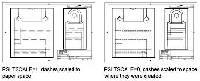 - With PSLTSCALE turned on, you can still control the dash lengths with LTSCALE and CELTSCALE. In the following illustration, the pattern of the linetypes in the drawing on the left has been scaled to be the same regardless of the scale of the view. In the drawing on the right, the scale of the linetypes matches the scale of each view.