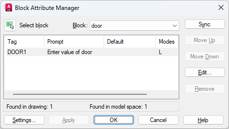 Removes the selected attribute from the block definition. If Apply Changes to Existing References is selected in the Settings dialog box before you choose Remove, the attribute is removed from all instances of the block in the current drawing. The Remove button is not available for blocks with only one attribute.