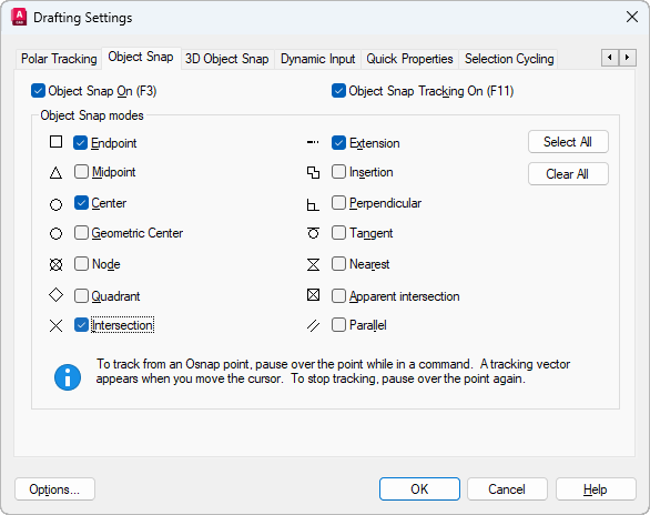 Lists object snaps that you can turn on as running object snaps.