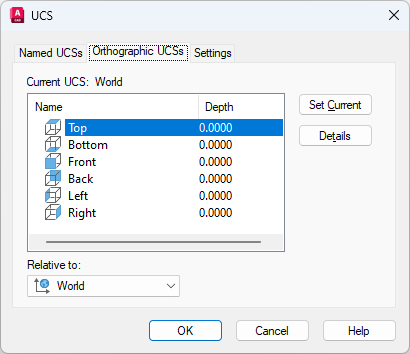 If you save an orthographic coordinate system in a drawing as part of a viewport configuration, or if you select a setting in Relative To other than World, the orthographic coordinate system name changes to Unnamed to distinguish it from the predefined orthographic UCS.