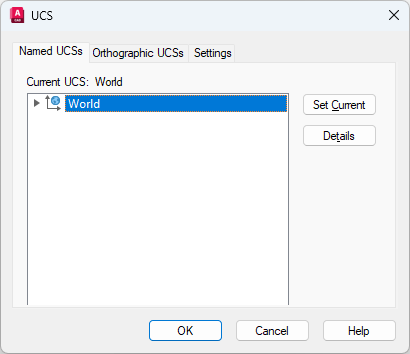 Displays the UCS Details dialog box, which displays UCS coordinate data. You can also view the details about a selected UCS by right-clicking the name and choosing Details.