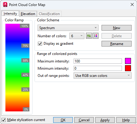 Note: For Intensity, Elevation, and Classification, the stylization is based on the color schemes assigned in the Point Cloud Color Map dialog box (POINTCLOUDCOLORMAP command). If the required data doesn't exist in the point cloud, the option is grayed out in the Stylization drop-down menu.