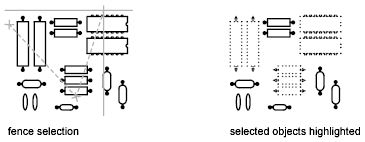 In a complex drawing, use a selection fence. A selection fence looks like a polyline and selects only the objects it passes through. The circuit board illustration shows a fence selecting several components.