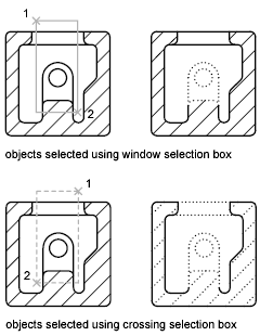 With a window selection, usually the entire object must be contained in the rectangular selection area. However, if an object with a noncontinuous (dashed) linetype is only partially visible in the viewport and all the visible vectors of the linetype can be enclosed within the selection window, the entire object is selected.