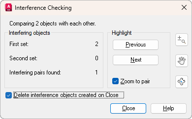 Closes the dialog box and deletes the interference objects if that option is selected.