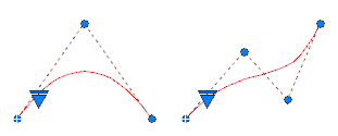 You can create or edit splines using either control vertices, or fit points. The spline on the left displays control vertices along a control polygon, and the spline on the right displays fit points.