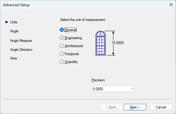 The Advanced Setup wizard contains five pages: Units, Angle, Angle Measure, Angle Direction, and Area. As you work in this wizard, choose Back and Next to navigate between pages; choose Finish on the last page to close the wizard and create the new drawing with the settings you specified.