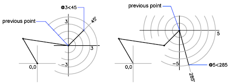 The following example shows two lines drawn with relative polar coordinates. In each illustration, the line begins at the location labeled as the previous point.