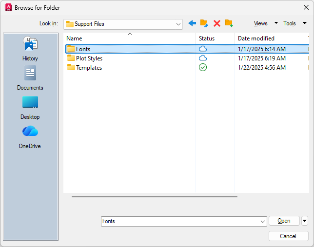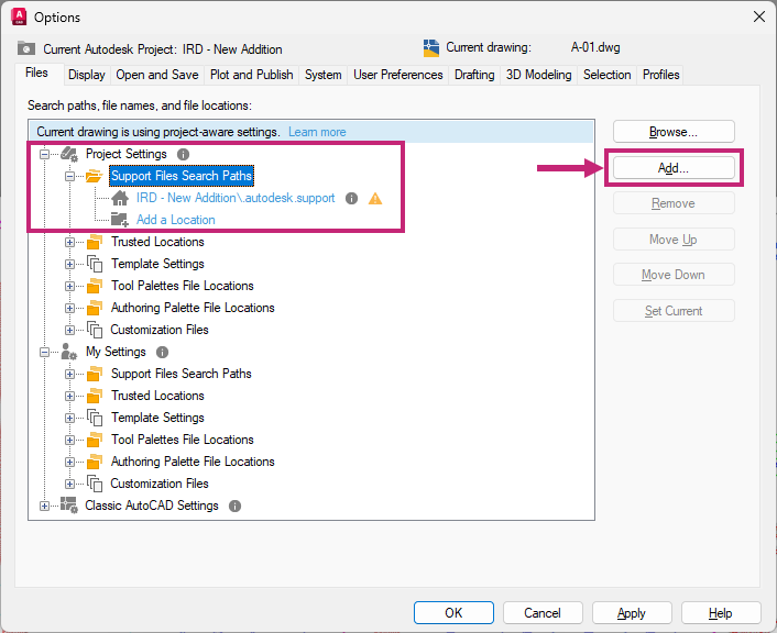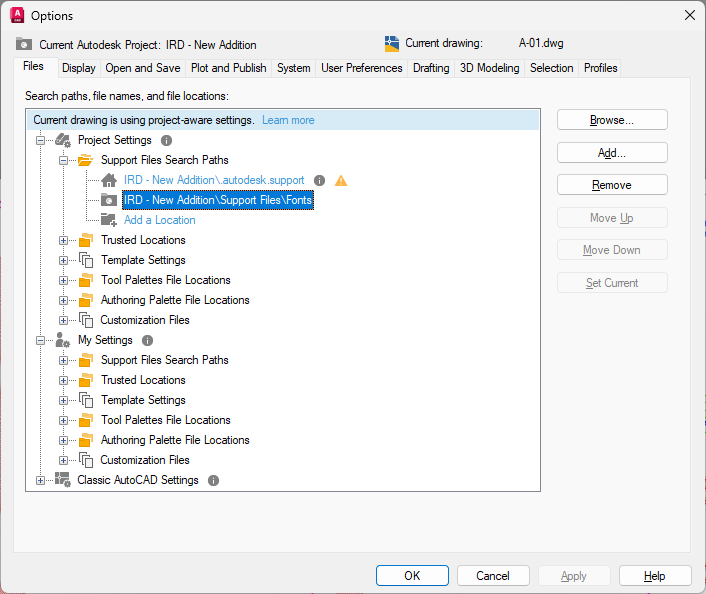 Forma Data Management has been set up to use Connected Support Files, you can set or change the paths of these settings. Paths are searched in the order that they are listed. If the same file is found in multiple folders, then the first instance found is used. Settings under Project Settings take precedence over My Settings and then Classic AutoCAD Settings.