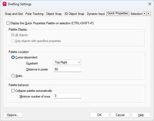 Sets the display settings of the Quick Properties palette. See Customize Quick Properties for more information.