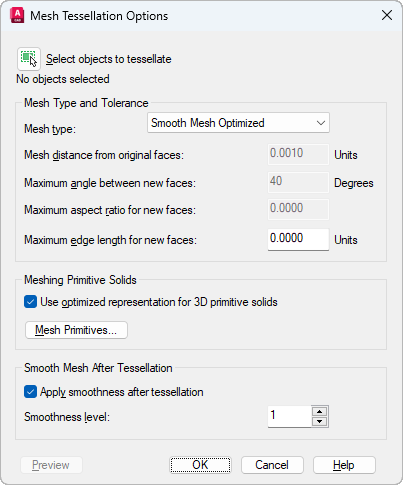 The defaults that you set in the Mesh Tessellation Options dialog box control the appearance of objects that you convert to 3D mesh objects. For a complete list of objects that can be converted to mesh, see the MESHSMOOTH command.