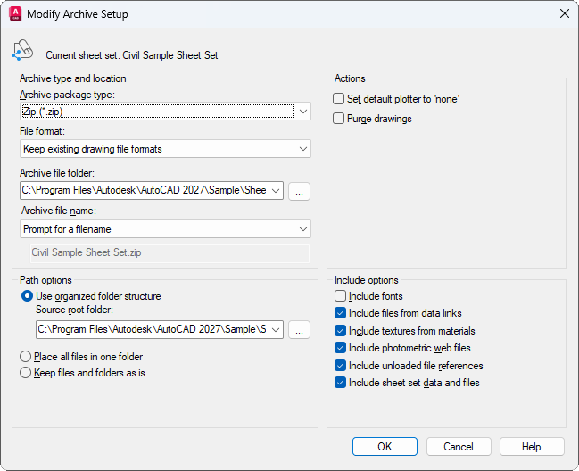 If this field is left blank, the archive file is created in the folder containing the sheet set data (DST) file.