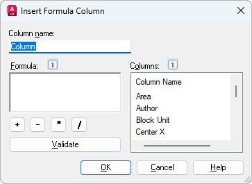Displays the column names from the extracted drawing data and external data (if data linking was established). Column names can be double-clicked to be added to the Formula field or dragged from the Column list to the Formula field. Existing formula columns are not listed and cannot be used as values for creating additional formula columns.