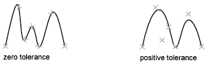 Specifies the distance by which the spline is allowed to deviate from the specified fit points. A tolerance value of 0 requires the resulting spline to pass directly through the fit points. The tolerance value applies to all fit points except the starting and ending fit points, which always have a tolerance of 0.