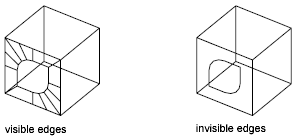 Controls which edges of a 3D face are visible, allowing for accurate modeling of objects with holes. Entering i or invisible before the first point of an edge makes the edge invisible.