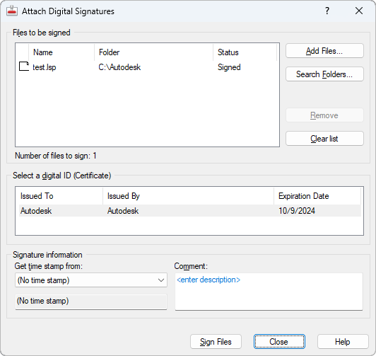 Attaches a digital signature to every file listed in this dialog box.