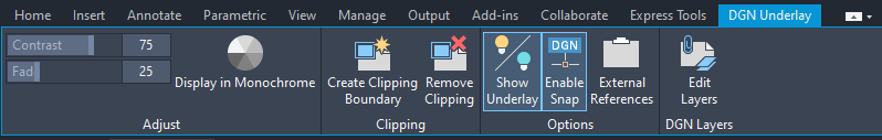 When you select a DGN underlay in a drawing, the DGN Underlay Contextual tab is displayed on the ribbon.