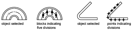 - Specify a number of equal distances between points or blocks on a selected object (DIVIDE command)