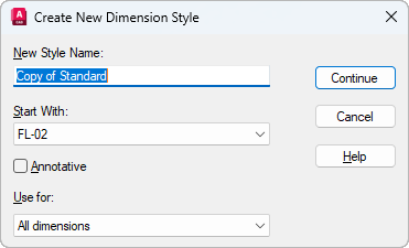 Names the new dimension style, sets the style on which to start the new one, and indicates the dimension types to which you want the new style to apply.