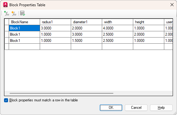 In the Block Properties Table dialog box, the column headings are parameters and the rows define the property set values. A selected block reference can be set to the defined values. Each block definition can have one table.