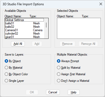 Lists available and selected 3D objects, saves 3D objects to layers, and handles objects that use multiple materials.