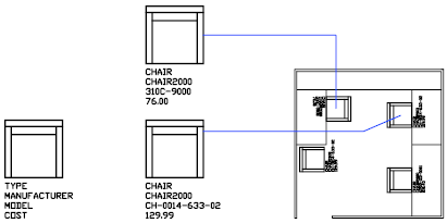 The following illustration shows a "chair" block with four attributes: type, manufacturer, model, and cost. Because the tags were set up as variables, specific information about each instance could be added for each inserted block reference.