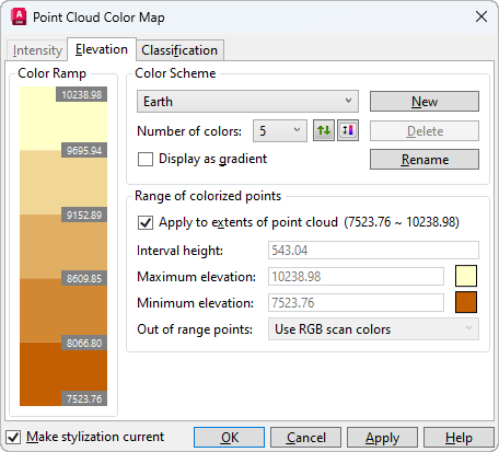 Edits the color scheme settings for Elevation point cloud stylization.