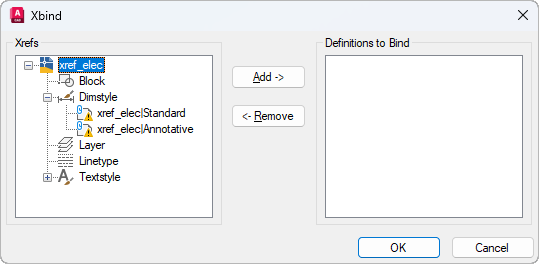 Merges xref-dependent named objects such as blocks, dimension styles, layers, linetypes, and text styles into your current drawing.