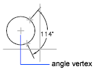 Uses the selection point as the origin of the first extension line. The center of the circle is the angle vertex.