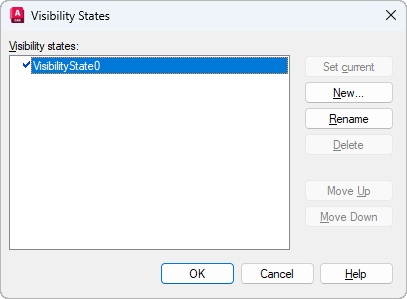 Lists the available visibility states for the current dynamic block definition. The order of this list is reflected in the dynamic block reference when the grip is clicked to display the list of visibility states. The state at the top of the list is the default state for the block reference.