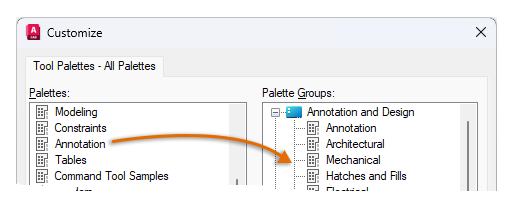 tool palette groups. A tool palette group limits the palettes shown in the Tool Palettes window. The Customize dialog box provides options for creating and organizing tool palette groups.