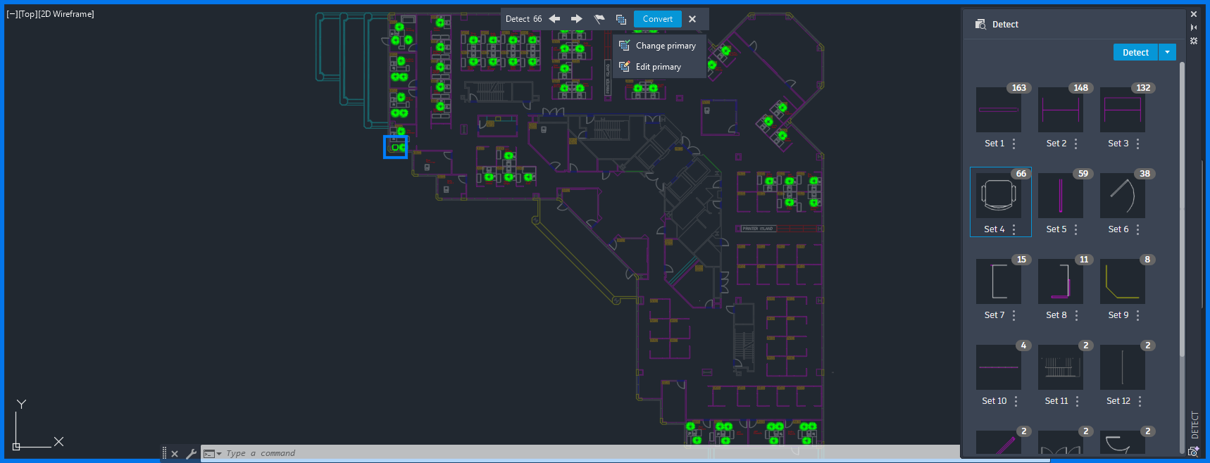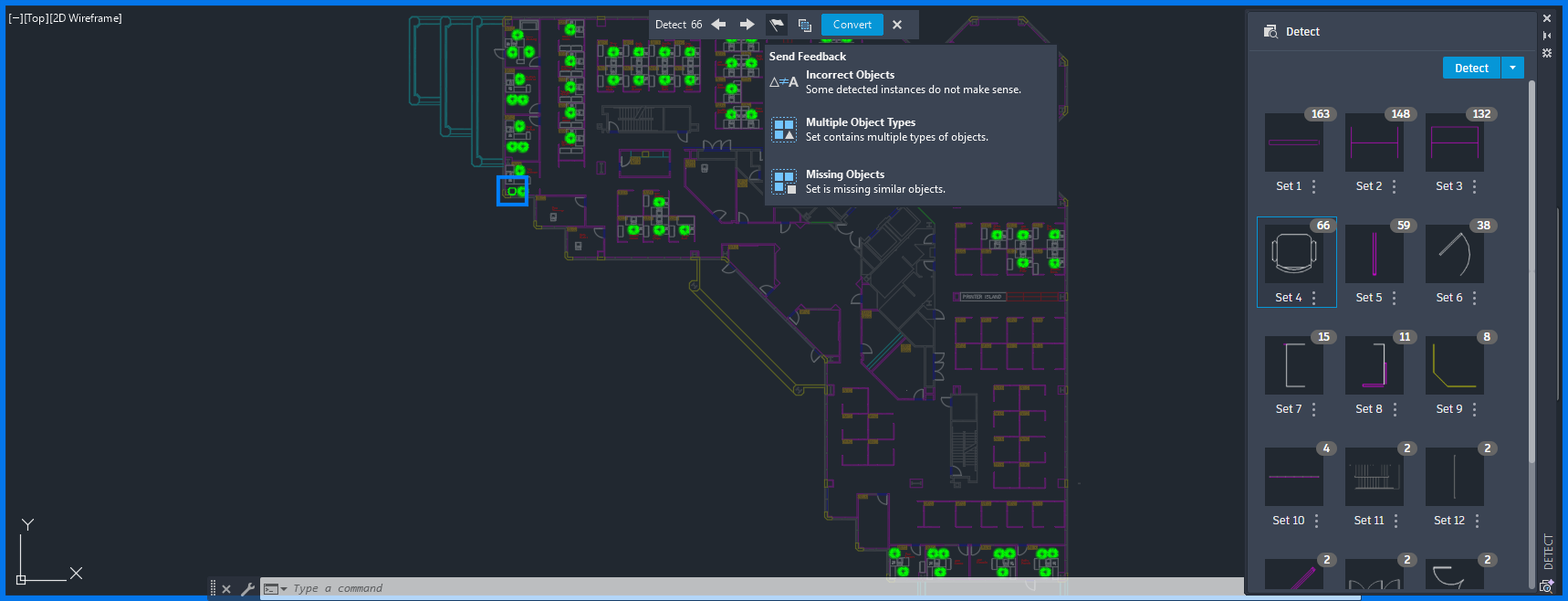 AutoCAD Detect and Convert uses Autodesk AI to scan your drawing and identify objects that can be converted into blocks.