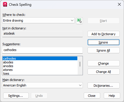 Checks the spelling in single-line text, multiline text, multileader text, text within block attributes, text within xrefs, and text added to dimensions.