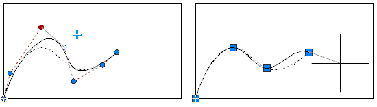 The editing options available with multifunctional grips differ depending on whether the spline is set to display control vertices or fit points. The spline on the left displays control vertices, and the one on the right displays fit points.